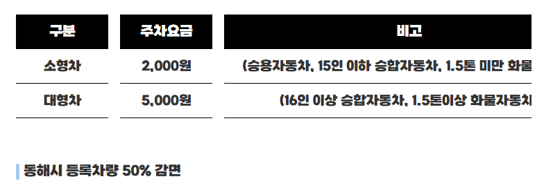 ※ 36개월 미만 아동 입장료 면제, 강원도민 입장료 50% 할인, 동해시 등록차량은 주차요금 50% 감면