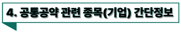 - 각 공약과 관련된 업종과 종목을 살펴보니 모든 후보들이 공통적으로 공약하고 있는 종목들이 있다는 것을 확인하실 수 있습니다.
