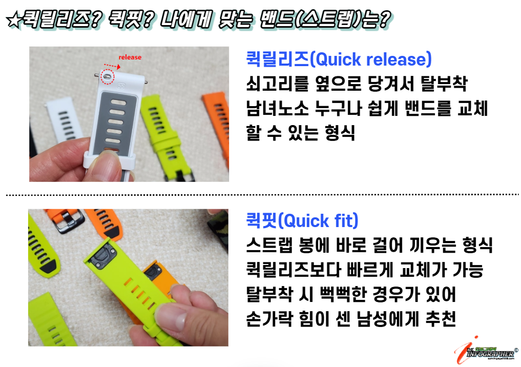 퀵핏과 퀵릴리즈는 시계 밴드(스트랩)의 종류입니다.