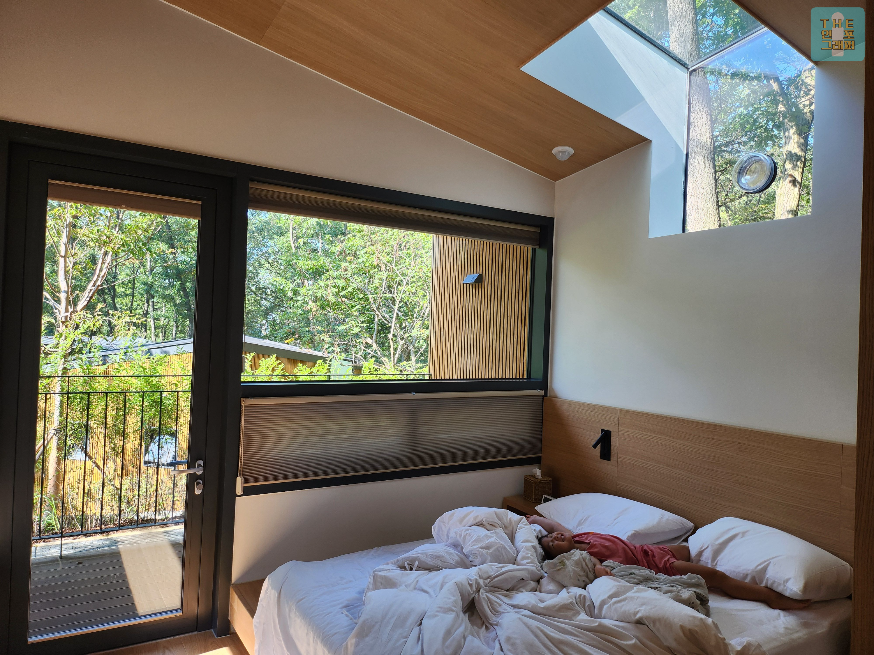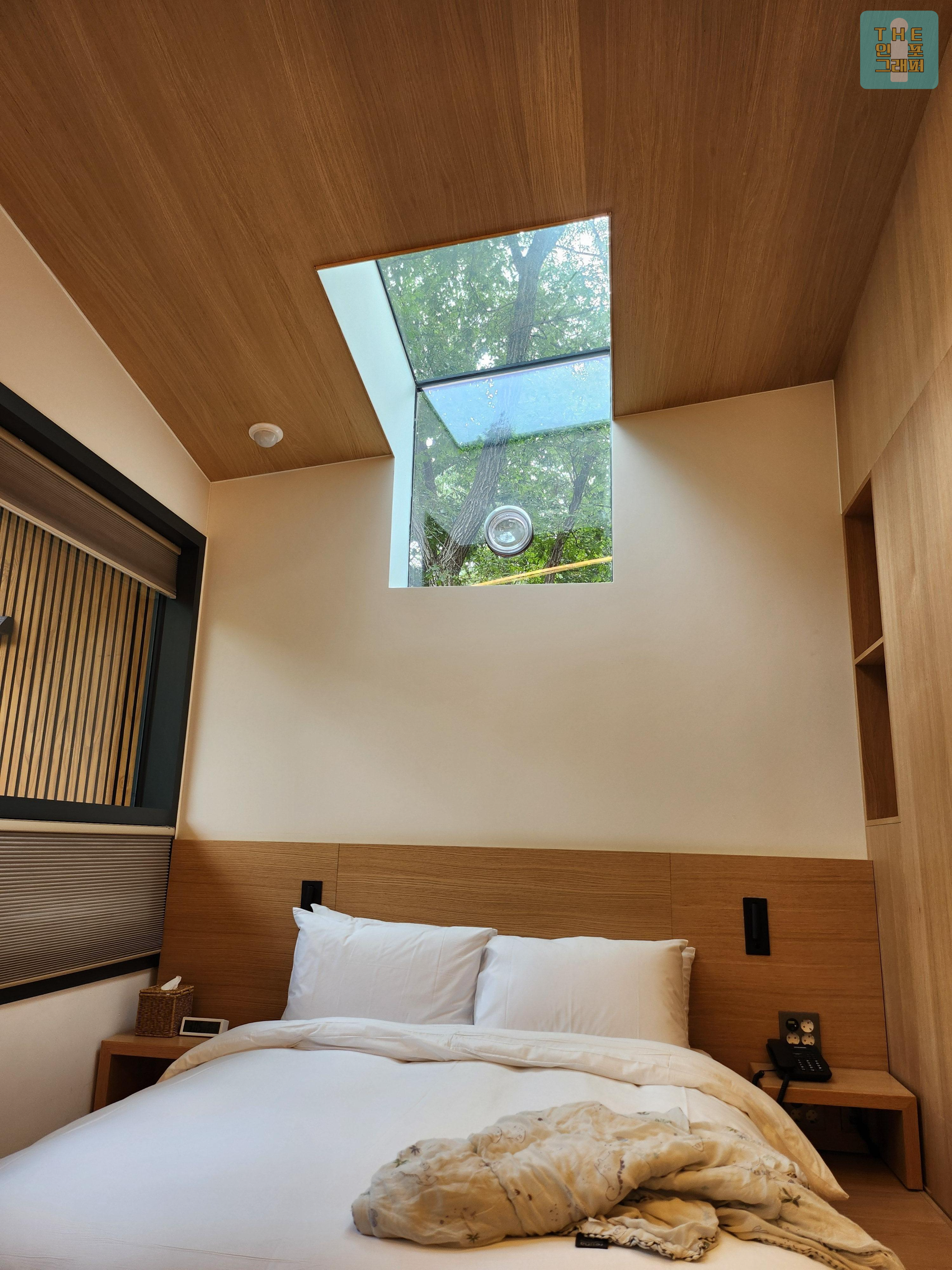 나무와 하늘이 보이는 천창, 그리고 모든 벽면에 창이 있어 자연광이 방 안을 가득 채웁니다.