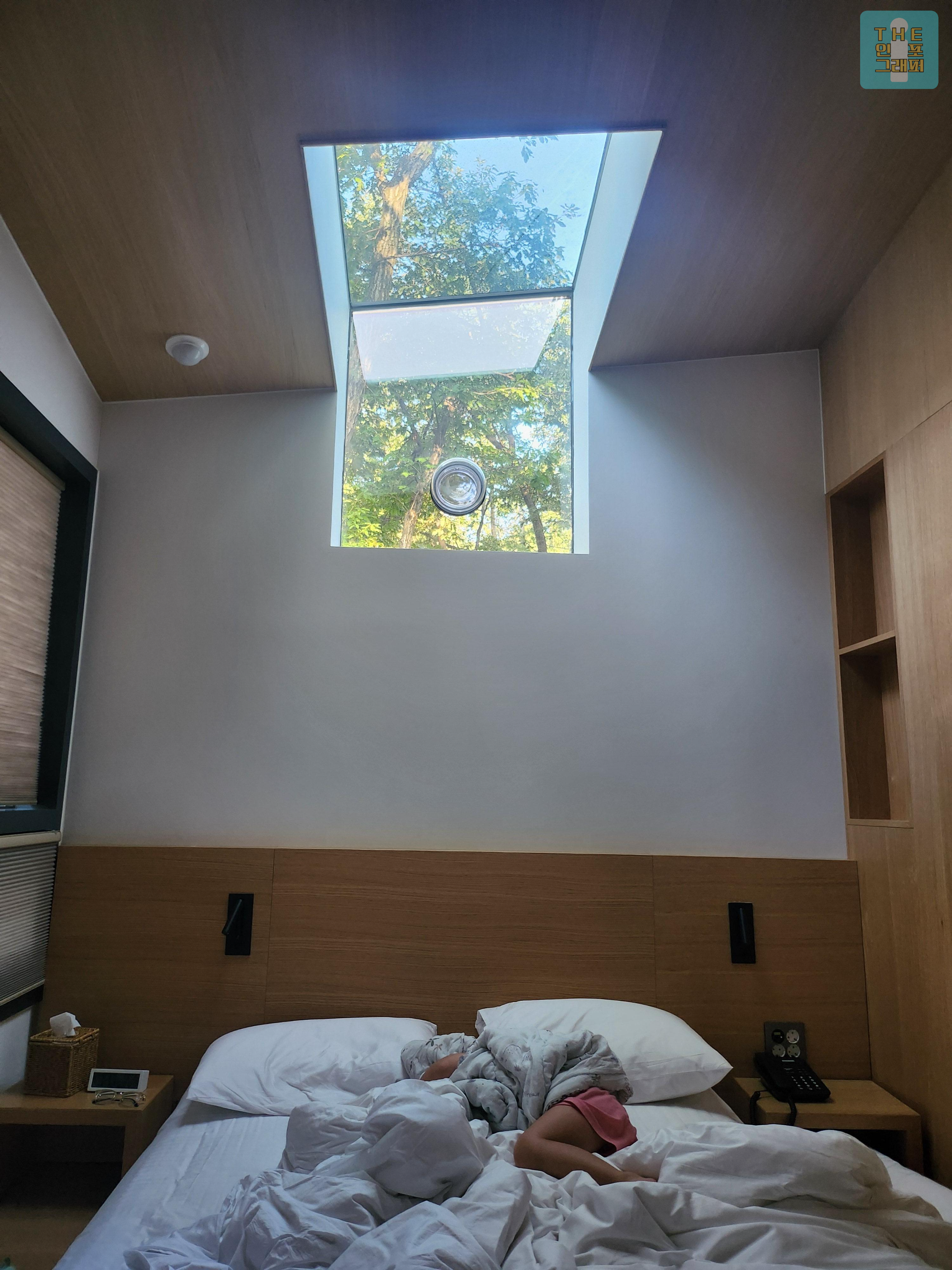 딸아이를 씻기고 함께 침대에 눕자 천창으로 밤하늘과 나무들이 보입니다.