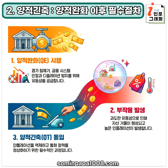 • 양적완화(QE)의 역할: QE는 경기 침체기와 금융 시스템 불안정 시기에 유동성을 공급하여 시장을 안정시키고 디플레이션(물가 하락)을 막는 데 기여합니다.